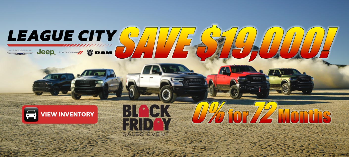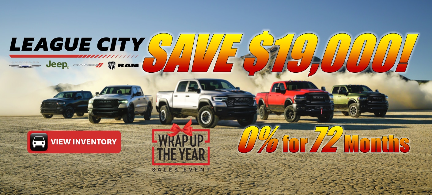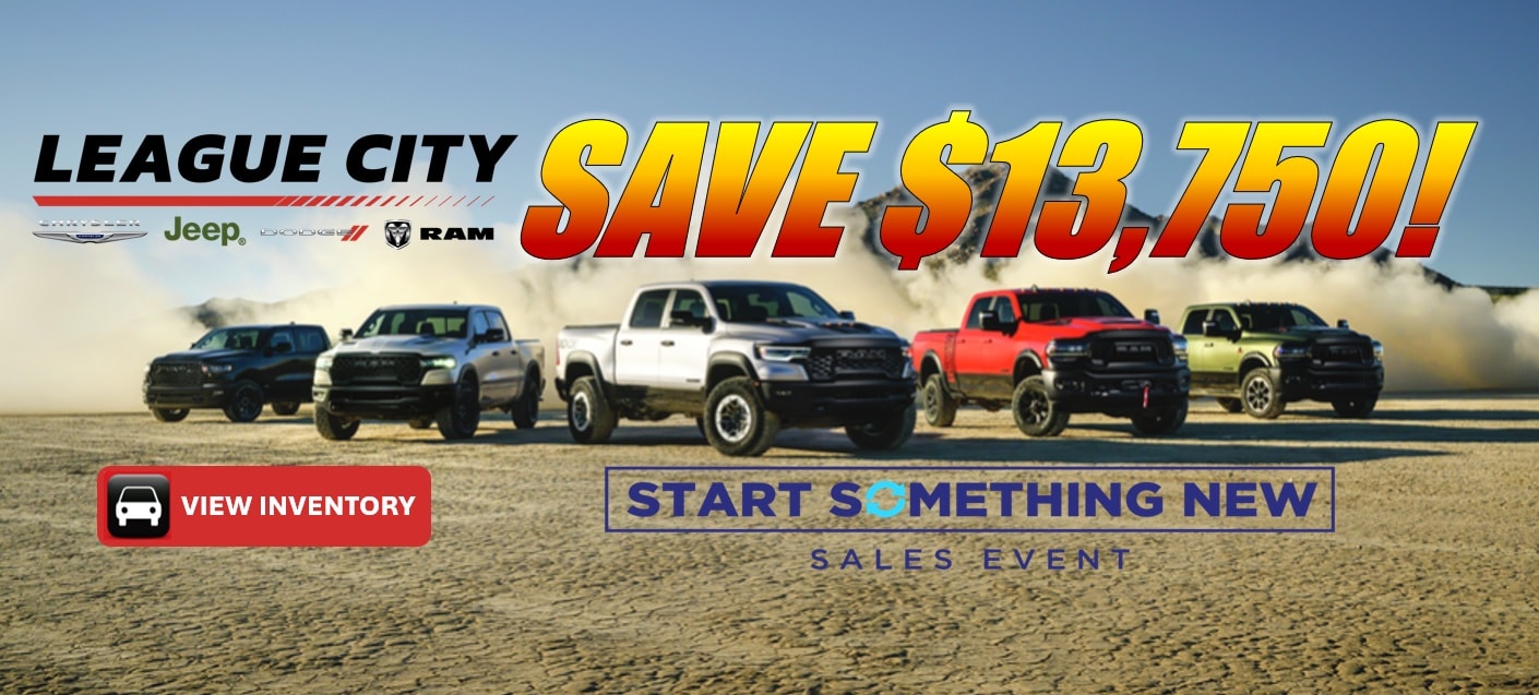 League City Chrysler Dodge Jeep Ram welcomes you to our local League City Chrysler Dodge Jeep Ram dealership near you. Visit our Chrysler Dodge Jeep Ram Showroom, Service Center, Finance Center, Leasing Office, and Auto Parts Store, all under one roof, to best serve you and your family. Whether you are looking for Chrysler Dodge Jeep Ram Deals, Service, Finance, Selection, or Online Car Buying, League City Chrysler Dodge Jeep Ram is here for you. Discover an exceptional range of Chrysler, Jeep, Dodge, and RAM cars, trucks, and SUVs right here in League City, Texas. At League City Chrysler, Jeep Dodge, RAM, we are your trusted local dealership offering extensive selection of new, used, and certified pre-owned vehicles for sale and lease. Whether you're searching for a powerful new truck or your next family, League City Chrysler Dodge Jeep RAM is here to help.