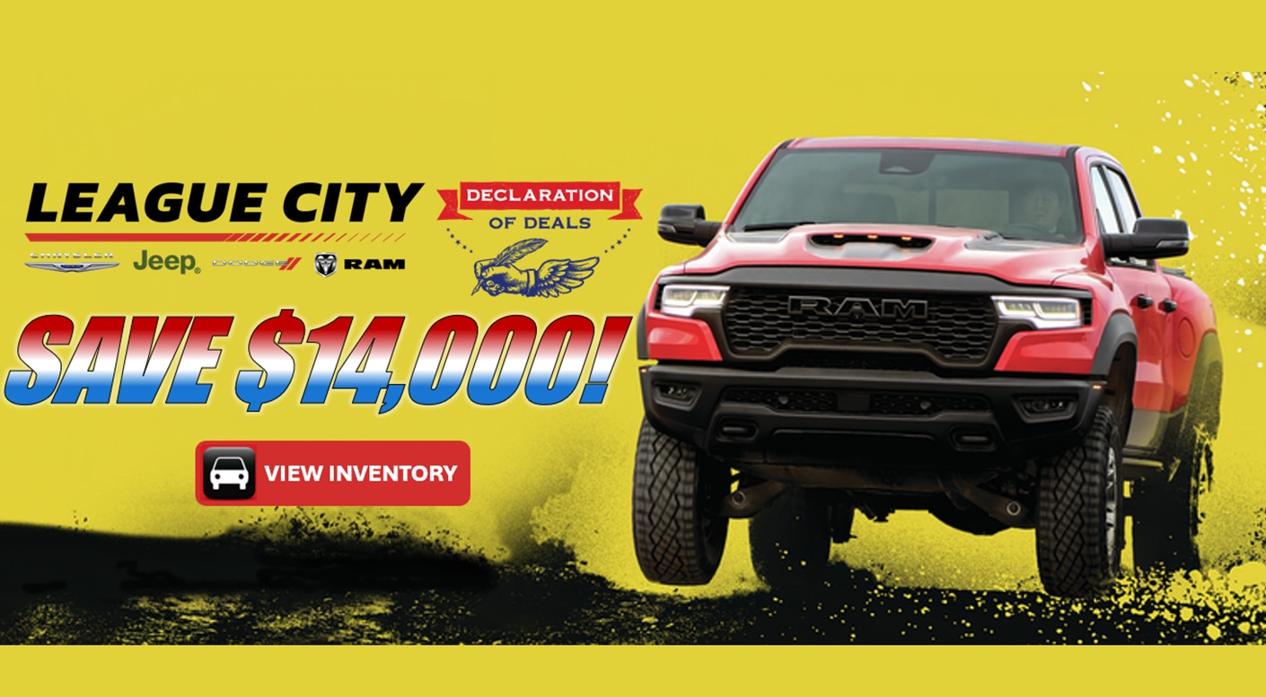 League City Chrysler Dodge Jeep Ram welcomes you to our local League City Chrysler Dodge Jeep Ram dealership near you. Visit our Chrysler Dodge Jeep Ram Showroom, Service Center, Finance Center, Leasing Office, and Auto Parts Store, all under one roof, to best serve you and your family. Whether you are looking for Chrysler Dodge Jeep Ram Deals, Service, Finance, Selection, or Online Car Buying, League City Chrysler Dodge Jeep Ram is here for you. Discover an exceptional range of Chrysler, Jeep, Dodge, and RAM cars, trucks, and SUVs right here in League City, Texas. At League City Chrysler, Jeep Dodge, RAM, we are your trusted local dealership offering extensive selection of new, used, and certified pre-owned vehicles for sale and lease. Whether you're searching for a powerful new truck or your next family, League City Chrysler Dodge Jeep RAM is here to help.