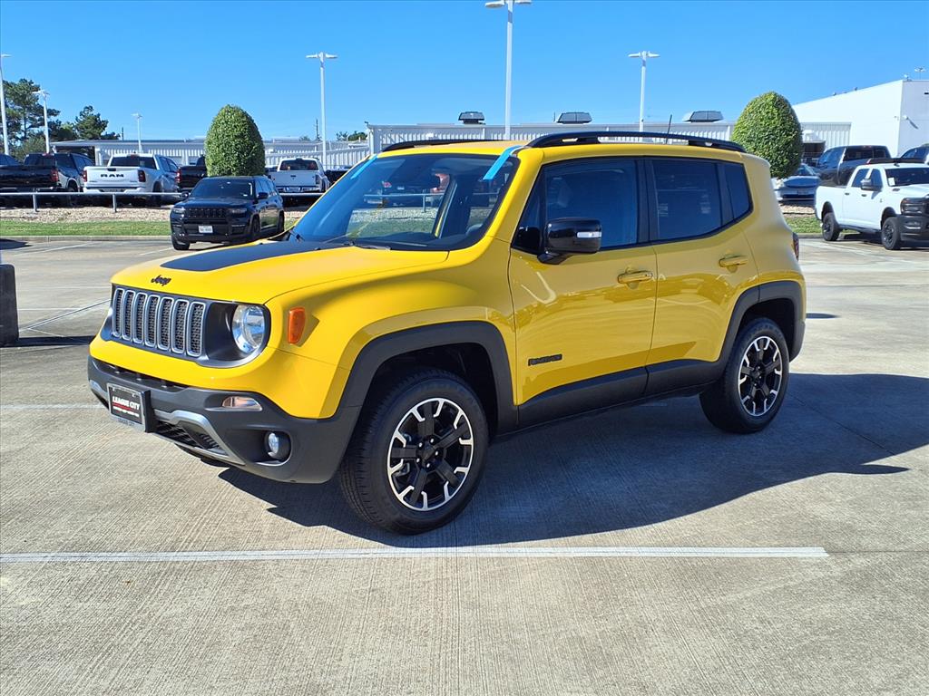 This 2023 Jeep Renegade Latitude is a state-of-the-art motorcar that has been meticulously maintained and driven with care. With 20,403 miles, this four-wheel drive vehicle has a 1.3 liter 4 cylinder engine and turbocharged powertrain that provides excellent fuel economy of 23 mpg in the city and 29 mpg on the highway. The exterior of this car is a striking shade of yellow with a black/bronze interior that is sure to turn heads. Safety features include blind spot sensor, hill start assist, on demand four wheel drive, and navigation with voice recognition and touch screen display. This car has been awarded a 4 out of 5 star crash test rating, making it the perfect choice for anyone looking for a reliable and stylish ride. The final price includes available non-conditional consumer cash incentives, incompatible with promotional APR or Lease Offers. Online price does not include tax, title, license fees, or dealer-installed options. Contact our Internet Sales Team @ 409.237.0765 to confirm availability and arrange your Test Drive!